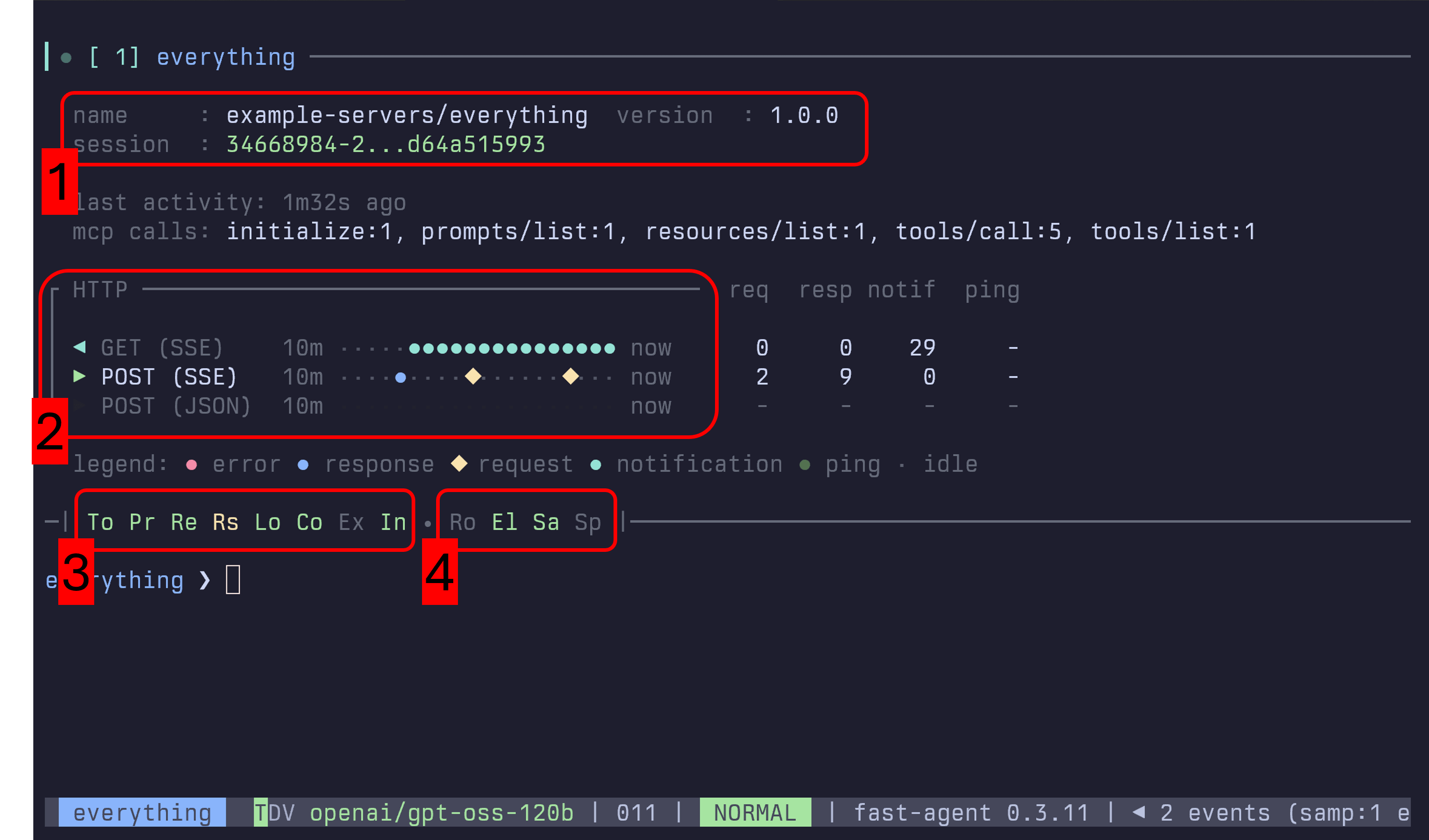 These values flow through to both fast-agent check and the in-session /mcp display. When multiple events occur in the same bucket, higher priority states replace lower ones using this order: error → disabled/request → response → notification/ping → none. This keeps significant events (such as errors and requests) visible even if a subsequent ping lands in the same interval.